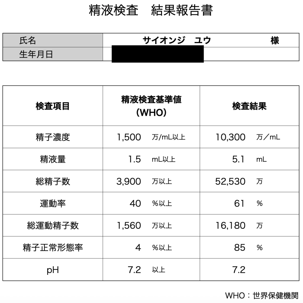 こちらは私自身の精液検査結果です。比較のため、WHOが世界的な大規模調査から示している基準値も参照してみます。